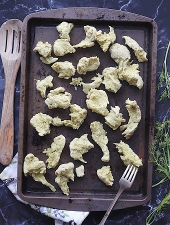 In a non-stick pan over medium heat, cook the sausages in a little oil. Once cooked, set them aside to cool completely. When they are cool enough to handle, tear them into tiny pieces. No need to wash the pan, you will be using it for pancakes in a bit and the sausage oil will taste good! Pop them in the freezer to cool completely while you make the pancake batter.