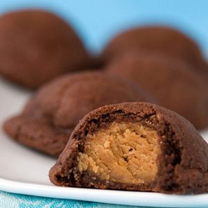 • Shape the cookies. Create the centers of the cookies by rolling the peanut butter dough into 24 balls. Scoop a generous tablespoon of chocolate dough, flatten into a disc and place a peanut butter ball in the center. Fold the sides of the chocolate dough up and around the peanut butter center and roll the chocolate ball into an smooth ball between your palms. Place on a sheet of waxed paper and repeat with remaining doughs. If desired gently flatten cookies a little, but this is not necessary.