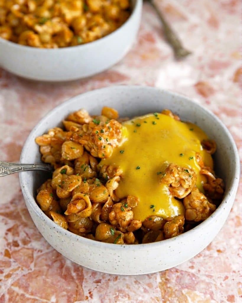 I am going to attempt this tomorrow… alas with some variations as I don’t have the onion/garlic powders or small shell pasta, but I do have chopped garlic/shallots and oversized penne pasta lol. Oh and no peas… But tempeh plus garlic/onion/herbs tastes amazing anyway 🙂