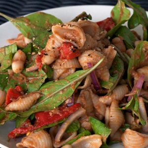 Forget that tired old pasta salad Aunt Gertrude brings to the family reunions, this salad is where it’s at! No mayo required, the Sundried Walnut Dressing gives up plenty of flavor, beans keep you stuffed and arugula gives you that Trattoria feel. So tell Aunt Gertrude she’s fired, but could she get you some fresh black pepper before she leaves? This recipe is modified from Appetite For Reduction.