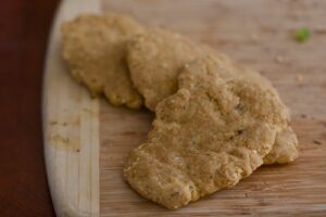 - Divide the cutlet dough into 2 equal pieces. Then divide each of those pieces into 4 separate pieces (so you’ll have 8 all together). To form cutlets, knead each piece in your hand for a few moments and then flatten and stretch each one into a roughly 6 by 4 inch rectangular cutlet shape. The easiest way to do this is to form a rectangle shape in your hands and then place the cutlets on a clean surface to flatten and stretch them. (OK, maybe my surface wasn’t that clean.)