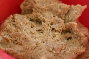 - Add the remaining ingredients and knead together for about 3 minutes, until strings of gluten have formed. The strings should look like this (click photo for an even closer up view):