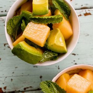 - In a large bowl, mix together lime juice and agave. Add the cantaloupe and a pinch of salt and toss to coat. Let sit for about 5 minutes so that cantaloupe releases some of its juice and the flavors melt.Toss in avocado and mint leaves. Taste for salt. You may want to adjust the sweetness and limey-ness as well. Serve immediately!