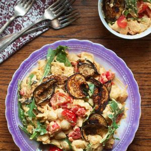 Being late summer, I really wanted this mac to be gardeny. If you have a garden, or a CSA, or just want to use some in-season produce from the grocery, maybe you’ll appreciate that. So I made the “B” out of eggplant (remember: vegans will make bacon out of anything.) For the “L”, arugula is always prolific in the garden, plus I love its muskiness, which goes perfectly with the bright and smoky flavors of the other ingredients.