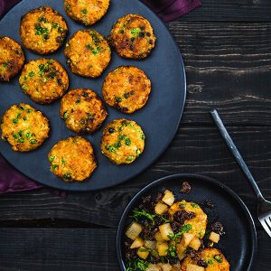 Worlds collide! My two favorite fried finger foods combine into one sublime bite. Curry powder, carrot, and peas give these potato pancakes a samosa flair, and some pear chutney seals the deal. You’ve got eight days of Hanukkah, so use one of them to break from the pack and serve these fun treats. The chutney recipe will make you want to start an artisanal chutney company in a formerly industrial area of Portland, Oregon! But if you don’t feel like making it, then apple sauce will do.