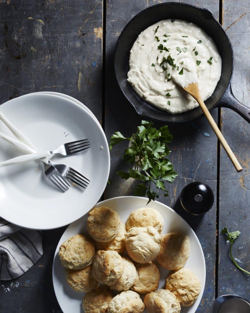 Vegan biscuits and gravy is rustic, soul-warming comfort food at its best. The minute these biscuits touch your lips you’ll feel it: fluffy, buttery bliss. The vegan white pepper gravy is kept really simple, but don’t be skeptical of the short ingredients list. The roux creates plenty of toasty goodness, with a bit of heat from the white pepper. Use a vegetable broth that you really love, because the flavor will shine through.