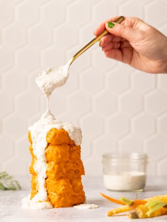 Here it’s served with some roasted veggies and garnished with rosemary and parsley, but you do you, boo. This recipe is from my cookbook Fake Meat! You should probably buy it 🙂