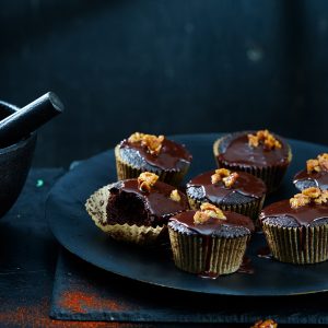 Add the sugar, oil, and vanilla extract to the milk mixture and mix vigorously until foamy. Mix in the orange zest. Sift in the flour, cocoa powder, baking soda, baking powder, salt, and cayenne. Mix until no large clumps of flour are left.